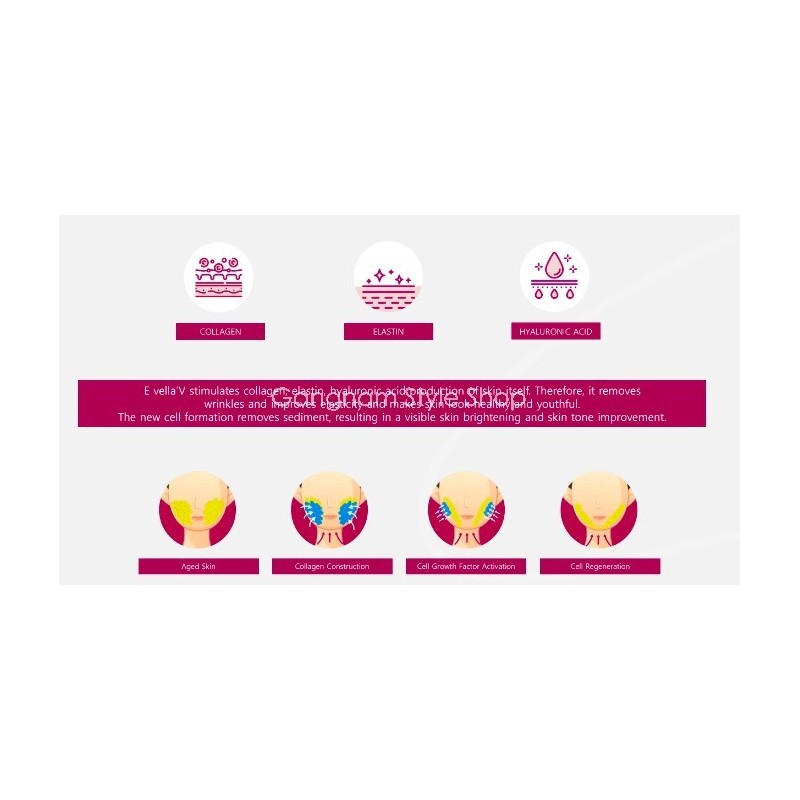 E bella’V has distinct formula differences from the existing contour ampoules. Glutathione ingredient enhances the brightening effect by promoting the action of vitamins, protecting the skin and preventing pigmentation. Also it contains cell growth factors and skin antioxidants that stimulates collagen promotion and helps to prevent wrinkles and maintain elasticity during the lipolysis process.