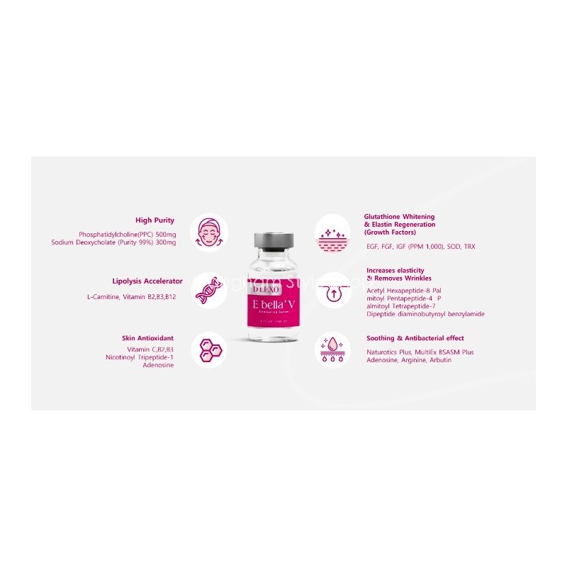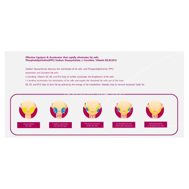 E bella’V is a New Highly Concentrated Formula Lipolysis Solution combined with PPC and Sodium Deoxycholate, L-carnitine and Vitamin B12, which further accelerates lipolysis, it promotes the metabolism of fat cells and dissolves fat cells safely and effectively.